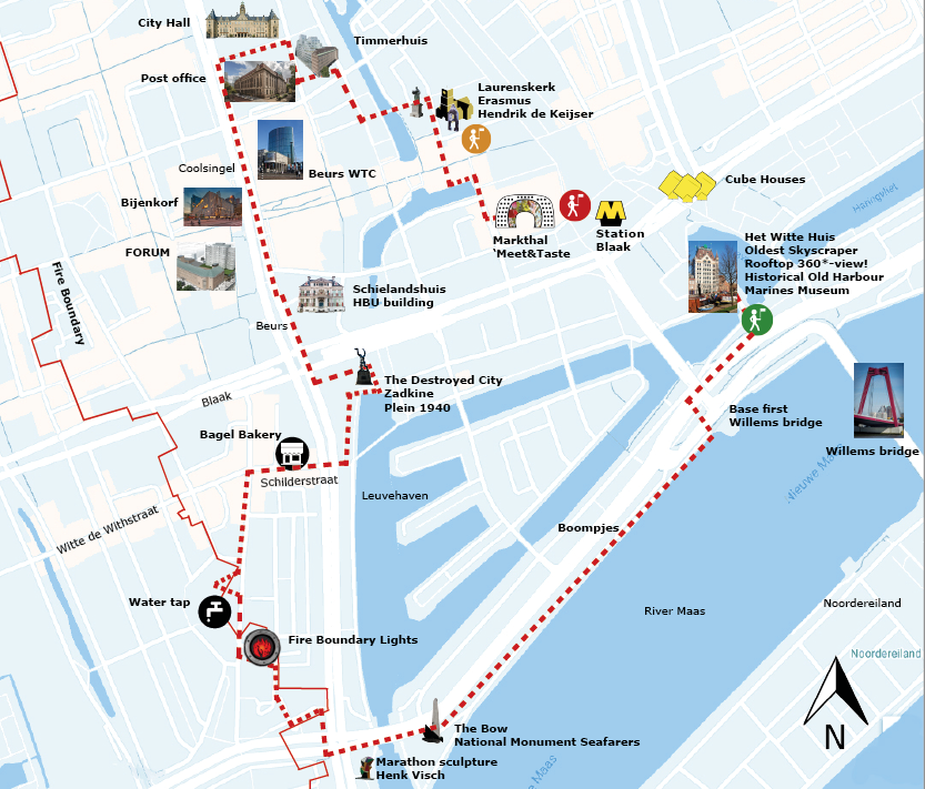 Het startpunt ligt vlakbij trein/metro/tram Blaak en bij watertaxisteiger Boompjes. Parkeren kan bijvoorbeeld onder de Markthal.